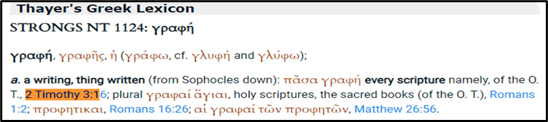 Strong’s Concordance (1124) – graphé: a writing, scripture. Thayer’s Greek Lexicon – a. writing, thing written (from Sophocles down): πᾶσα γραφή every scripture namely, of the O. T.